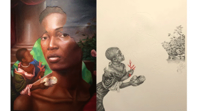 So this painting right here is Titus Kaphar, and this drawing right here is Barbara Walker, and they were situated in the gallery opposite each other, so they were facing one another. They are both referencing the same artwork, a European piece by Pierre Mignard of a woman. And you can kind of barely see her in one, and then she’s cut out in the other artwork. And we see only the girl who was enslaved.